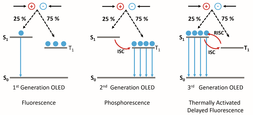 Fluorescence is the emission of electromagnetic radiation light by a substance that has absorbed radiation of a different wavelength. Fluorescence and phosphorescence 34 phosphorescence and intersystem crossing although population of triplet states by direct absorption from the ground state is insignicant a more ecient process exists for population of triplet states from the lowest excited singlet state in many molecules. Since the triplet state has generally lower energy than the excited singlet phosphorescence occurs at longer wavelengths lower frequencies and can easily be distinguished from fluorescence.